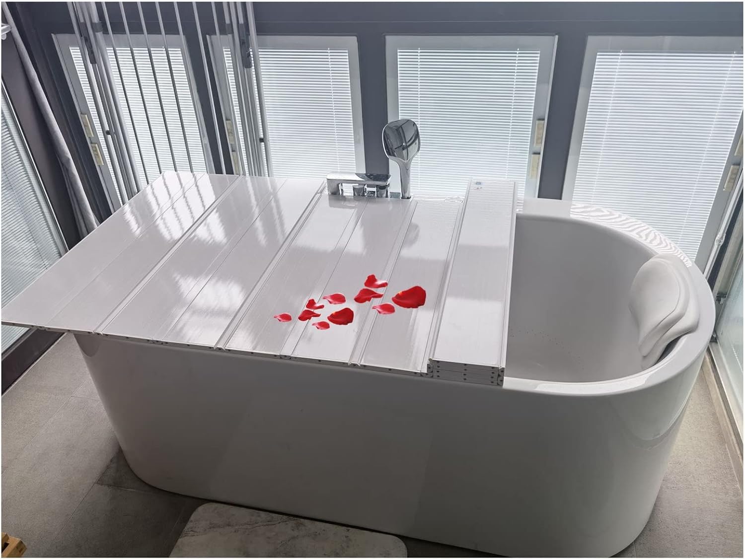The insulation cover doubles as an elegant bath shelf for luxury spa or reading sessions. The rigid, flat top provides a stable platform for your relaxation essentials—place your book, tablet, phone, or a small cup of tea within easy reach while you soak. The shutter-style design allows you to partially open the lid while keeping one section as a stable tray for your belongings. When not in use as a cover, fold it flat and store it in narrow spaces like between the wall and a cabinet, behind a door, or under a bed.